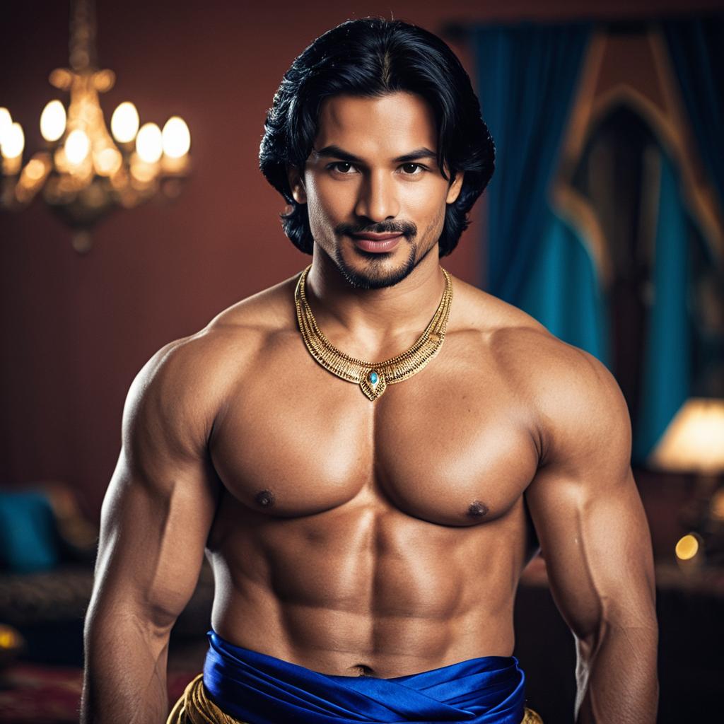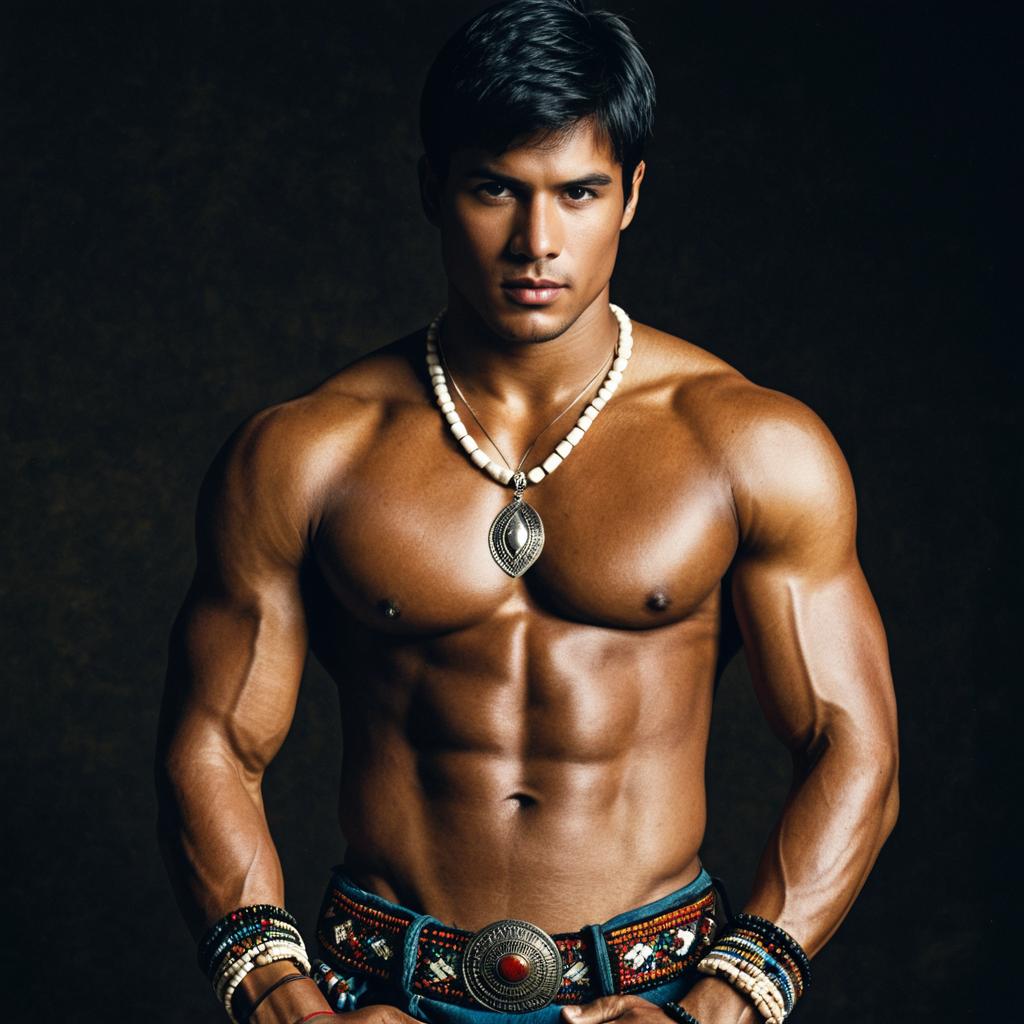 Portrait of a muscular young man with short black hair wearing traditional Zulu-inspired jewelry including a beaded necklace with a large pendant and multiple bracelets. The topless male displays defined abs and pectoral muscles against a dark background, standing in a confident pose facing the viewer.