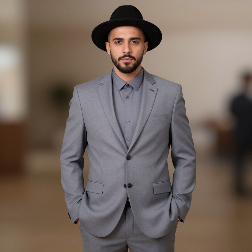 Banarsi suit costume, 1boy, male focus, solo, facial hair, beard, hat, blurry background, jacket, blurry, hands in pockets, looking at viewer, mustache, long sleeves, buttons, black hair