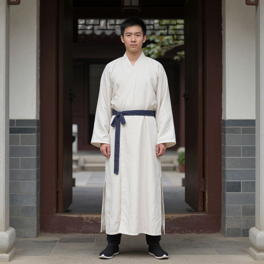 Photograph of an Asian man standing in a doorway. He has short black hair and a neutral expression, wearing a traditional white martial arts gi with a dark blue belt tied at the waist. He also wears black martial arts shoes with white soles. The doorway has dark wooden frames and is flanked by white walls with grey brick lower sections. The background shows a blurred outdoor area with some greenery. The man is centered in the image, standing straight, with his hands by his sides.