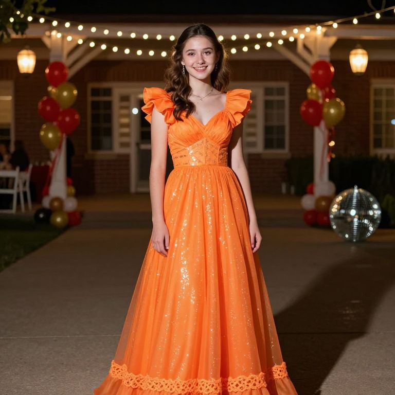 A teenage girl with long brown hair and hazel eyes is wearing a vibrant orange prom dress with ruffled sleeves and a fitted bodice, standing in the center of a dimly lit high school courtyard during a prom night. The dress has a sparkly, glittery finish and includes a lace trim along the hem. She smiles warmly at the camera, illuminated by soft fairy lights and strings of hanging lanterns. The background features a classic prom setup with red and gold decorations, balloons, and a large disco ball reflecting on the ground.