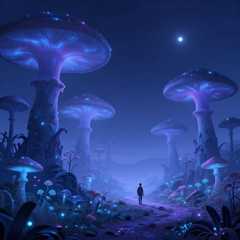 This digital artwork depicts a mystical, blue-lit forest night scene. Towering, glowing mushrooms with luminescent caps illuminate the landscape, casting a soft blue light. A lone figure, silhouetted against the light, stands in the center, surrounded by smaller bioluminescent mushrooms and plants. The sky is a deep blue, with a full moon visible in the upper right corner. The texture of the mushrooms and plants is detailed, with a mix of organic and surreal elements. The scene exudes a magical, otherworldly atmosphere, blending fantasy and nature in a vivid, ethereal style.
