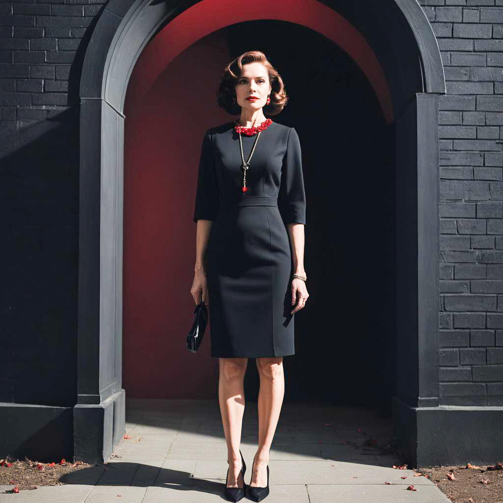 Photo of a Proportionate Body woman, Wavy Side Part, funeral outfit, black knee-length, Crimson Crepe, kitten heels, statement necklace, Modern archway, dramatic shadows and highlights