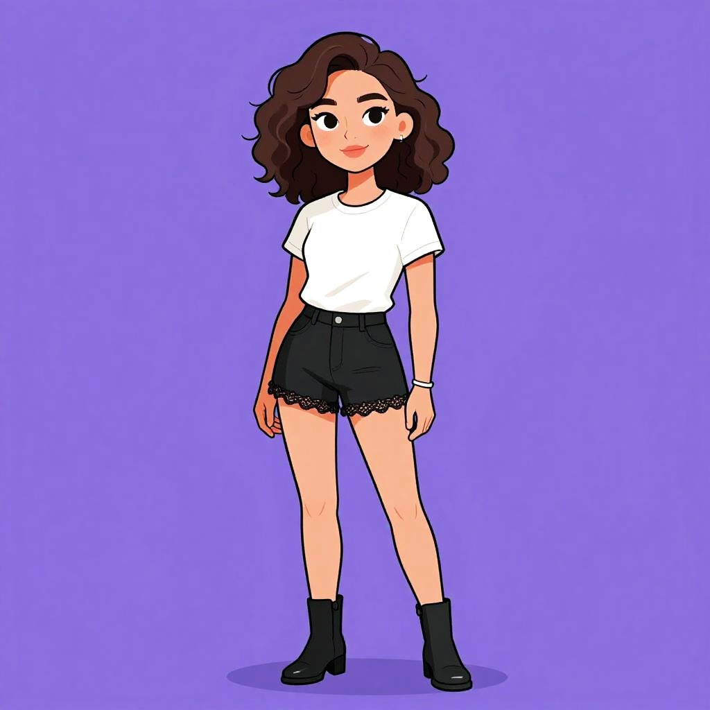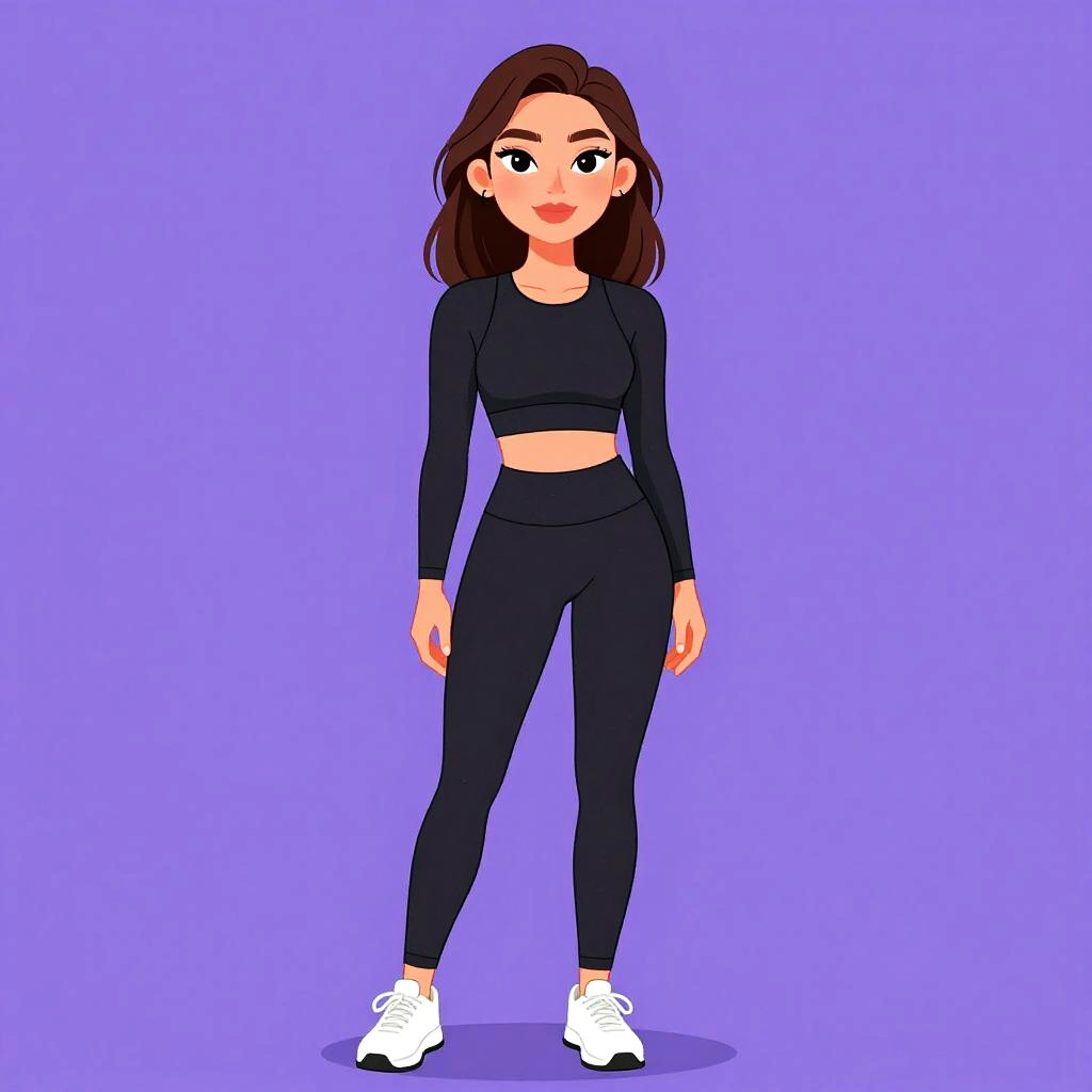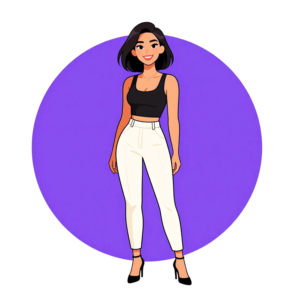 Woman with pretty face and pretty hair. smiling Woman, minimalist, cropped black tank top, scoop neck, cream high-waisted trousers, pleated fronts, tapered fit, ankle length, black strappy heels, delicate gold necklace, white studio background. --sref 1467