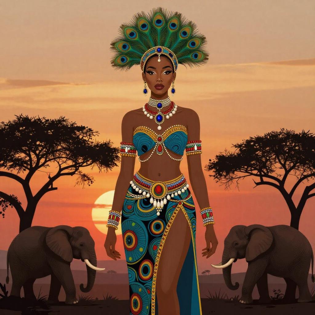 Illustration of a majestic Black woman styled with peacock-inspired attire and traditional African jewelry, standing serenely against a vibrant African sunset. The scene features silhouette acacia trees and blue-accented elephants, creating a rich and colorful African-inspired design.