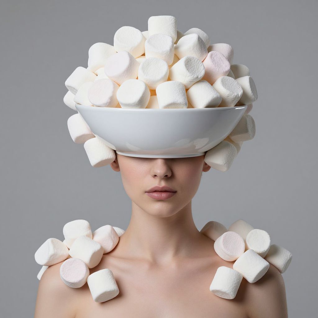 Photograph of a fair-skinned, androgynous person with a neutral expression, wearing no clothing. A white bowl filled with numerous small, white, fluffy marshmallows is placed on their head, partially obscuring their eyes. Additional marshmallows are scattered around their shoulders and upper chest. The background is a plain, light grey, creating a minimalist and surreal aesthetic. The image emphasizes the contrast between the soft texture of the marshmallows and the smooth skin of the subject. The overall composition is striking and whimsical, highlighting the unusual placement of the marshmallows.