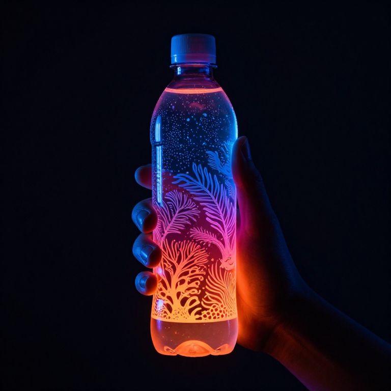 A hand, rendered in a striking neon noir color scheme, holds a transparent water bottle filled with intricate stippling. The bottle, glowing with a gradient of neon colors from blue to orange, is adorned with detailed patterns that resemble underwater scenes, including corals and marine life. The hand, with its fingers wrapped around the bottle, casts a shadow that adds depth to the composition. The overall arrangement creates a sense of intimacy and focus on the bottle's detailed artwork, making it the central element of the image.