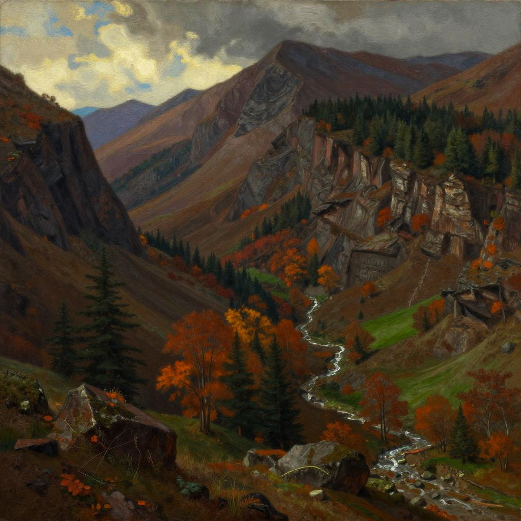 Create a Jean Dubuffet-inspired abstract rural landscape with bold forms, hyper-realistic landscape painting with muted brown, dull red, and faded green, cinematic lighting and ultra-detailed textures.