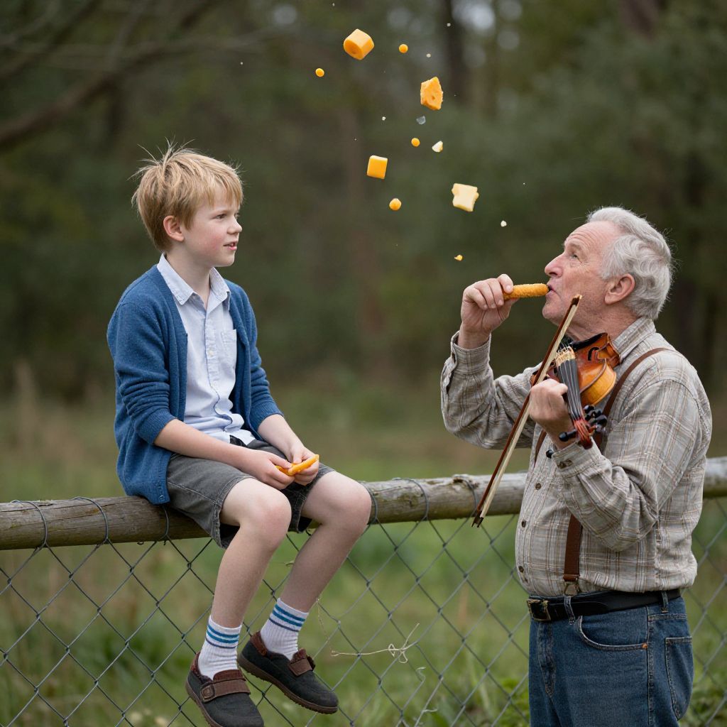 Photograph of an older white man with gray hair, wearing a checkered shirt and blue jeans, standing and blowing small orange cubes into the air with a wooden flute. A young white boy with blond hair, wearing a blue cardigan, white shirt, gray shorts, striped socks, and black shoes, sits on a wooden fence, watching him. They are outdoors, surrounded by a grassy field and trees in the background. The fence has a chain-link top, and the man's violin is slung over his shoulder. The boy holds a small orange cube in his hand. The image is vibrant with a slightly blurred background.