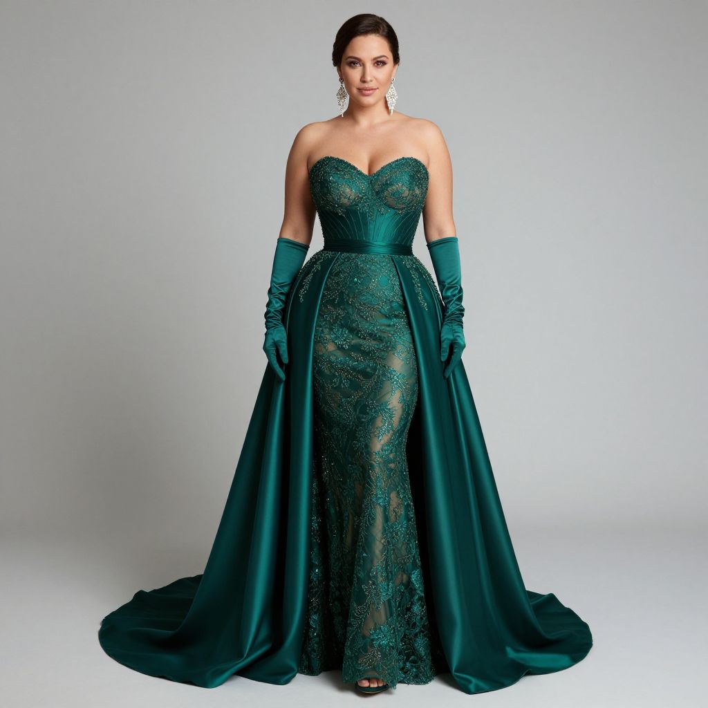 Full body shot, Curvy woman, elegant strapless gown, rich emerald silk, fitted bodice, flowing A-line skirt, intricate lace overlay, delicate beading, sweetheart neckline, floor-length hem, dramatic train, cinched waist, subtle shimmer, matching satin gloves, statement chandelier earrings, sleek updo hairstyle, soft makeup, classic stiletto heels, luxurious fabric draping, timeless sophistication Sexy. Pretty face and beаutiful eyes. Big breasts