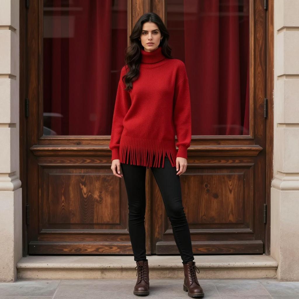 Formal winter wear costume, photograph of a young woman standing outdoors, full body, winter clothes, long red wool coat, white button-up shirt, beige scarf, brown boots, gray beanie with pom-pom, white gloves, urban background, blurred tree and building, daytime, realistic style, front view, casual, streetwear, neutral expression, cityscape, realistic ures