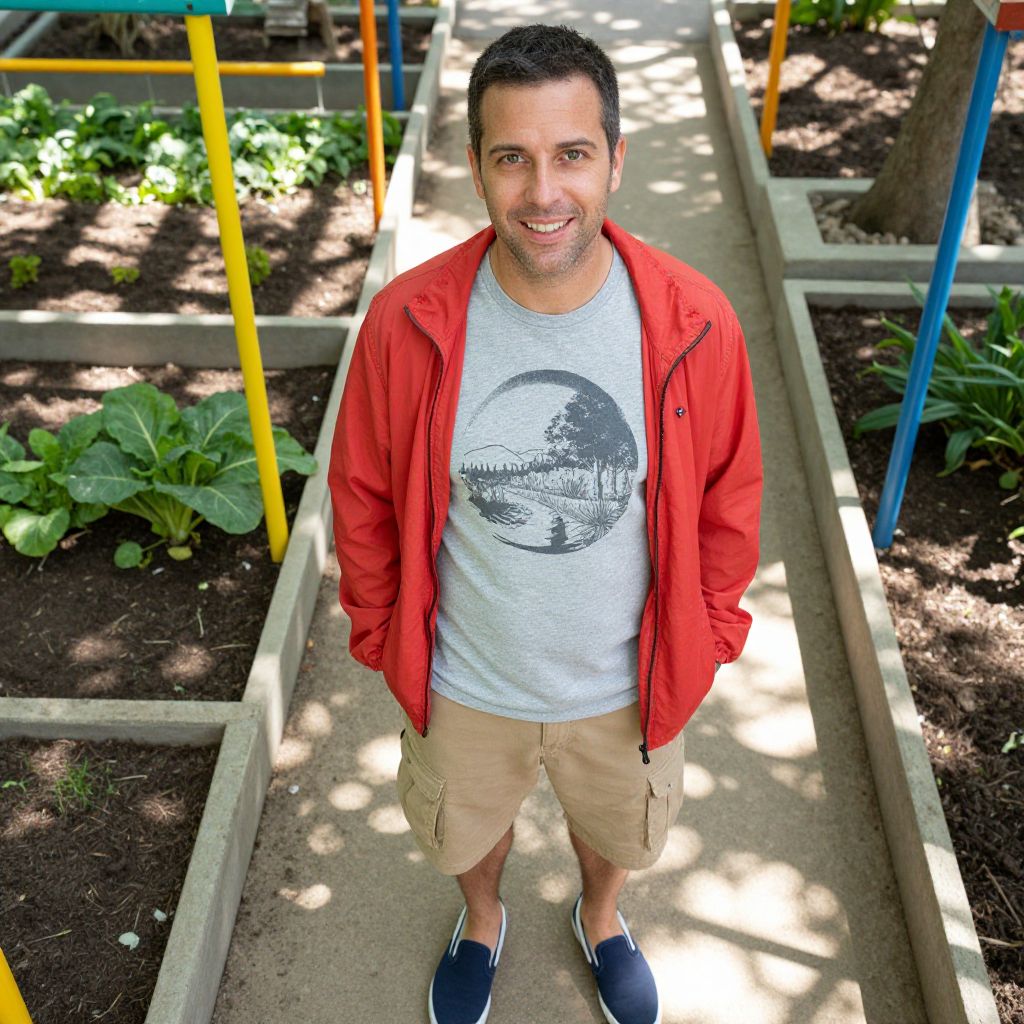 A man, relaxed weekend style, soft cotton graphic tee in heather gray, cargo shorts in khaki, slip-on canvas shoes in navy, lightweight windbreaker in bright red, raised vegetable plots, colorful trellises, sun-dappled pathways, overhead shot, cheerful expressionMan has masculine face and piercing eyes