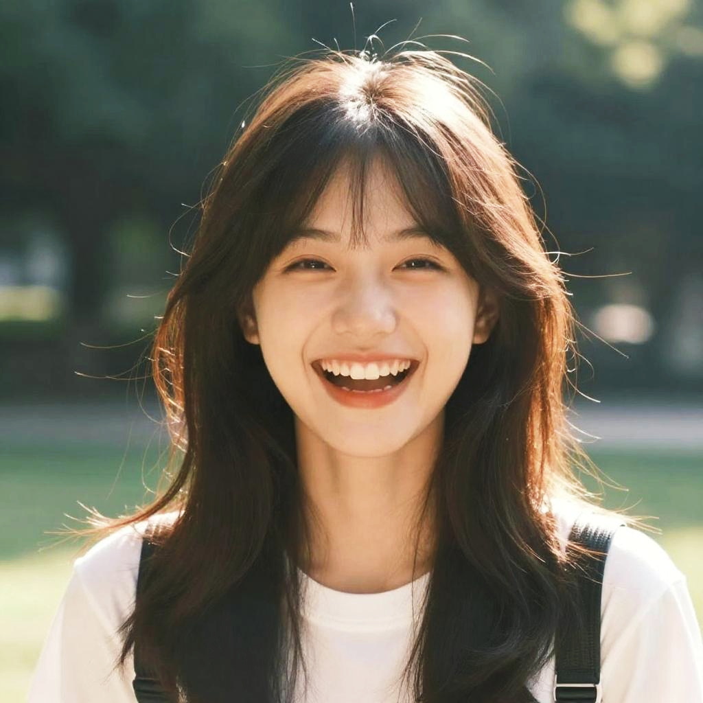 Are bangs sexy? Playful girl with wispy bangs laughing, sunlit park setting, warm tones and natural light, carefree vibe, soft focus background, youthful and fresh aesthetics.