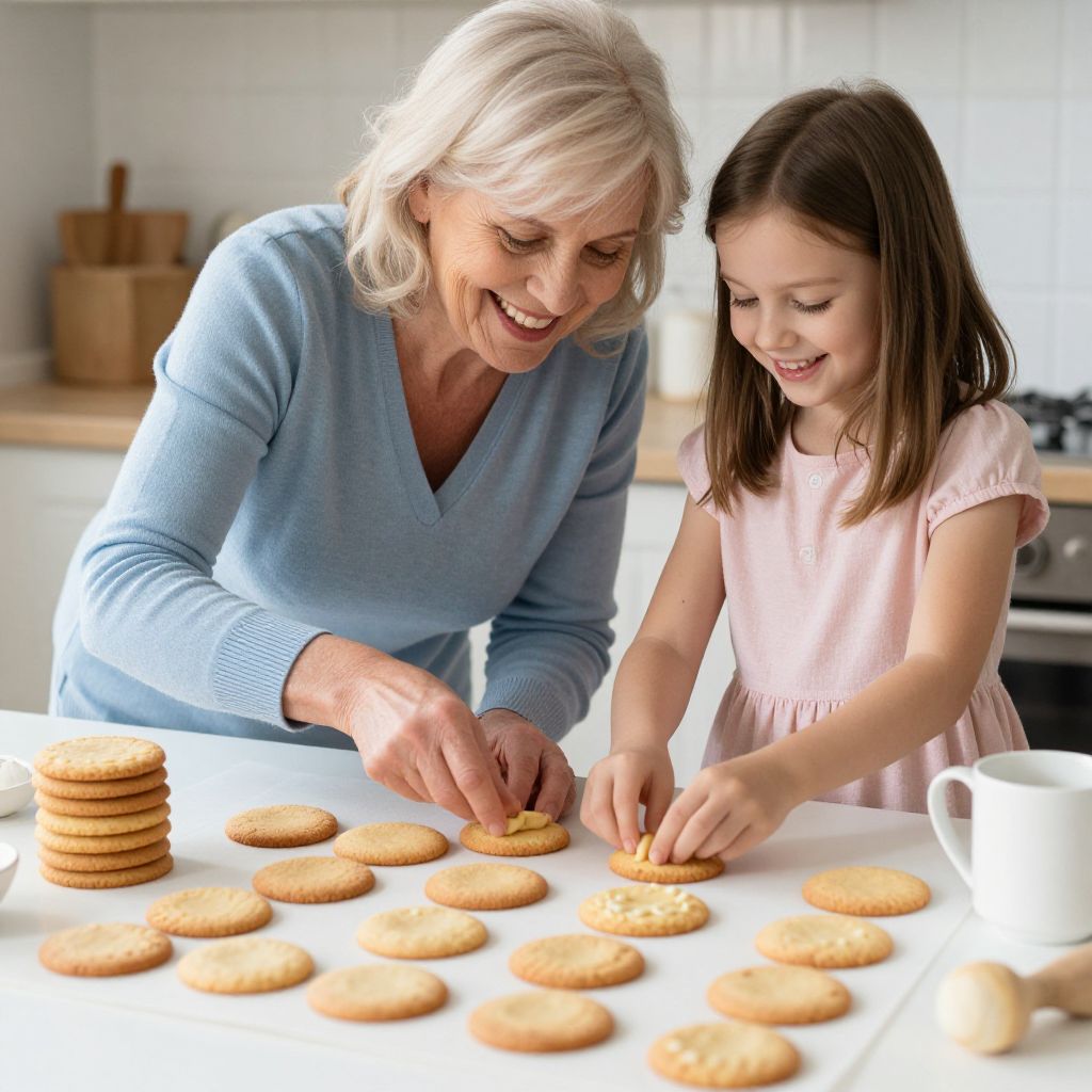 Photograph of an elderly woman with gray hair and a beige sweater, and a young girl with brown hair and a white shirt, smiling as they arrange round, golden-brown cookies on a white table. The girl points at a cookie while the woman assists. A stack of cookies is on the left and a white mug is on the right. The background is blurred with soft, natural light and hints of kitchen decor. Both appear happy and engaged in the activity.