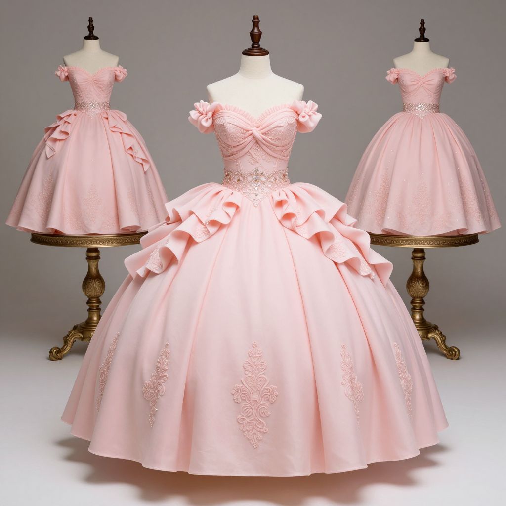 Elegant frothy pink 1950s prom dress displayed on a mannequin, featuring intricate lace detailing, floral embellishments, and a voluminous tulle skirt, set against a backdrop of vintage decor including a floral-patterned curtain, a framed painting, and a vase of pink roses.