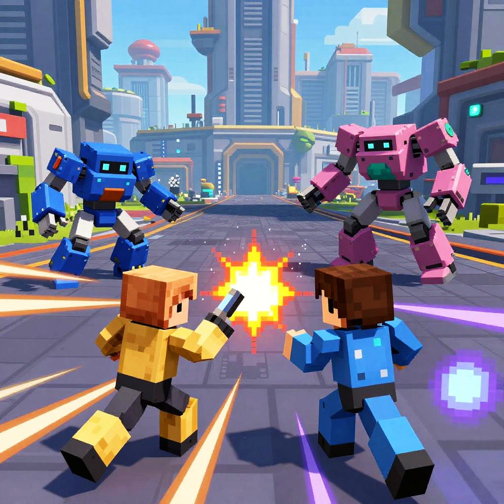 CrossCode dynamic combat scene showcasing fast-paced movement and elemental attacks, the pixelated protagonist fighting robotic creatures in a sprawling futuristic cityscape, with detailed background elements and glowing effects enhancing the action.