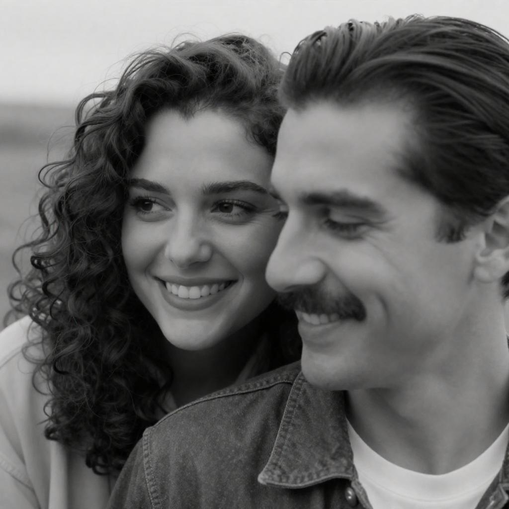 Black and white photograph of a man and woman in a dress fitting room. Man in shiny satin shirt and black bow tie, woman in strapless, beaded wedding dress holding bouquet. Man holds fabric, woman looks at him. Background includes dress racks and mirrors. Woman's hair is curly, man has short hair and mustache. Both looking at each other.