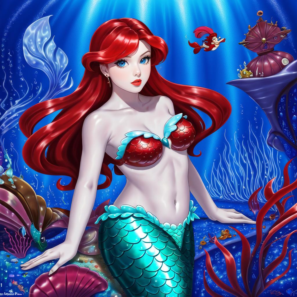 Ariel (disney), the little mermaid, 1girl, red lips, blue eyes, red hair, long hair, medium breasts, navel, shell bikini, mermaid, by artist bukkuri, anime