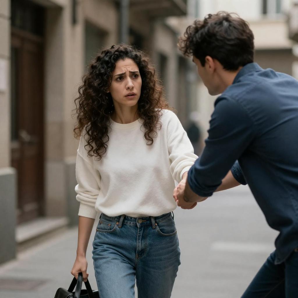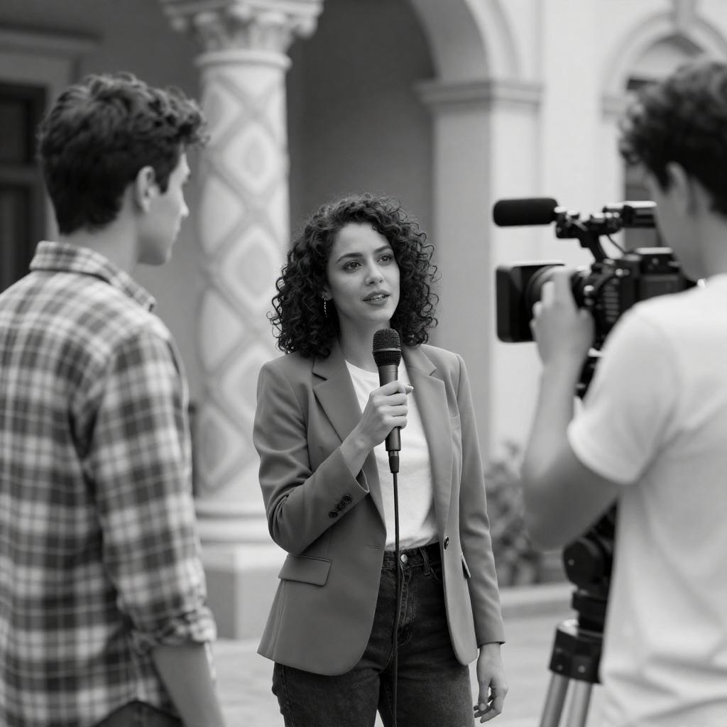 Black-and-white photograph of a film set. A woman with curly hair, wearing a blazer and holding a microphone, stands center, speaking to a man in a plaid shirt on the left. Another man, in a white shirt, operates a camera on the right. Background features ornate, patterned columns.