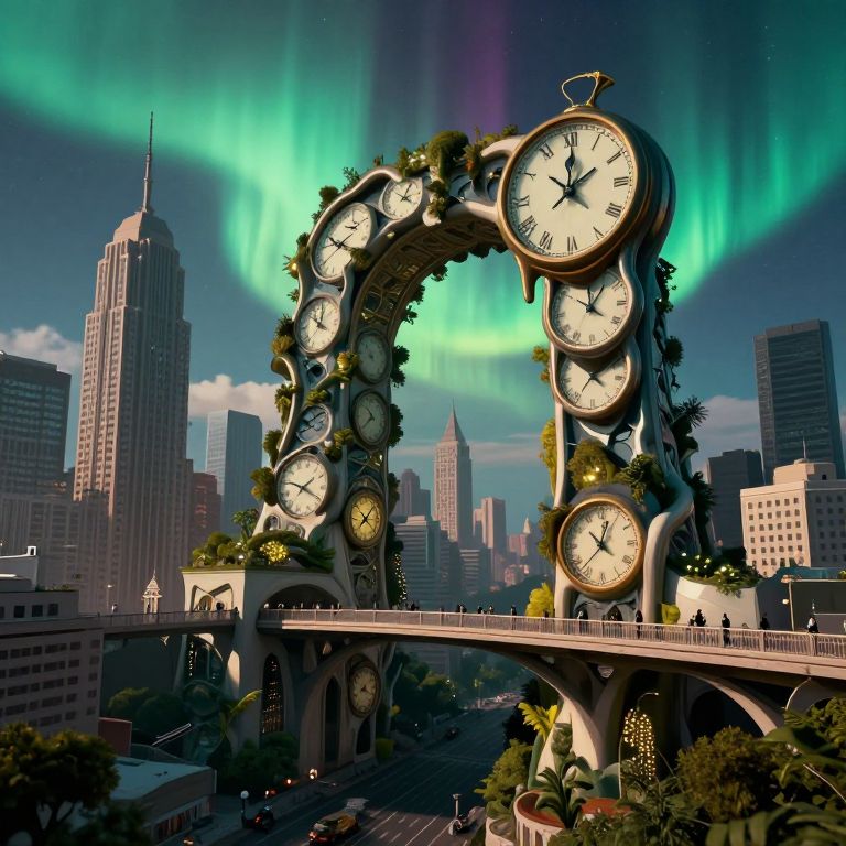 This digital artwork features a surreal cityscape with a large, intricate clock archway composed of multiple clock faces, each with Roman numerals, intertwined with green vines and small plants. The archway is elevated on a bridge with a few small figures walking across it. The background showcases a vibrant city with tall skyscrapers under a night sky illuminated by vivid green and purple Northern Lights. The clock faces are detailed with white faces and black hands, and the bridge has a modern, sleek design. The scene combines realistic urban elements with fantastical, whimsical clockwork architecture.