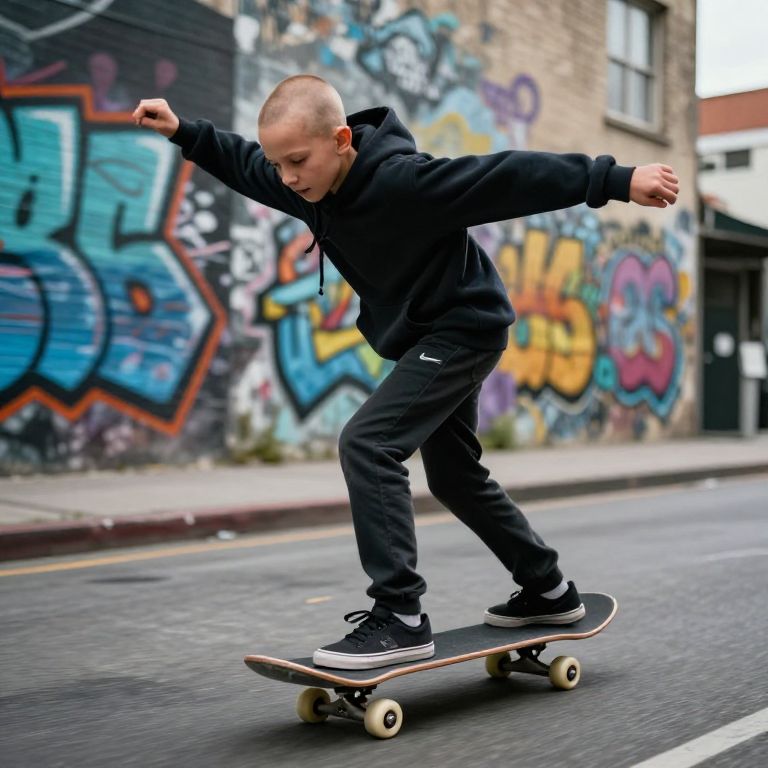 Bald 13 year old boy riding a skateboard on an urban street, dynamic motion, wearing a hoodie and sneakers, graffiti walls in background, energetic expression, cinematic lighting