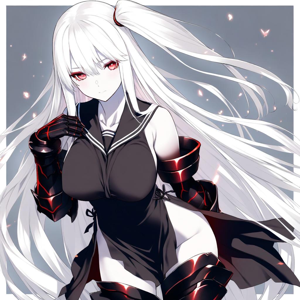 Airfield princess, kantai collection, 1girl, white skin, pale skin, horns, red eyes, white hair, very long hair, long hair, large breasts, by artist mikagami mamizu, anime