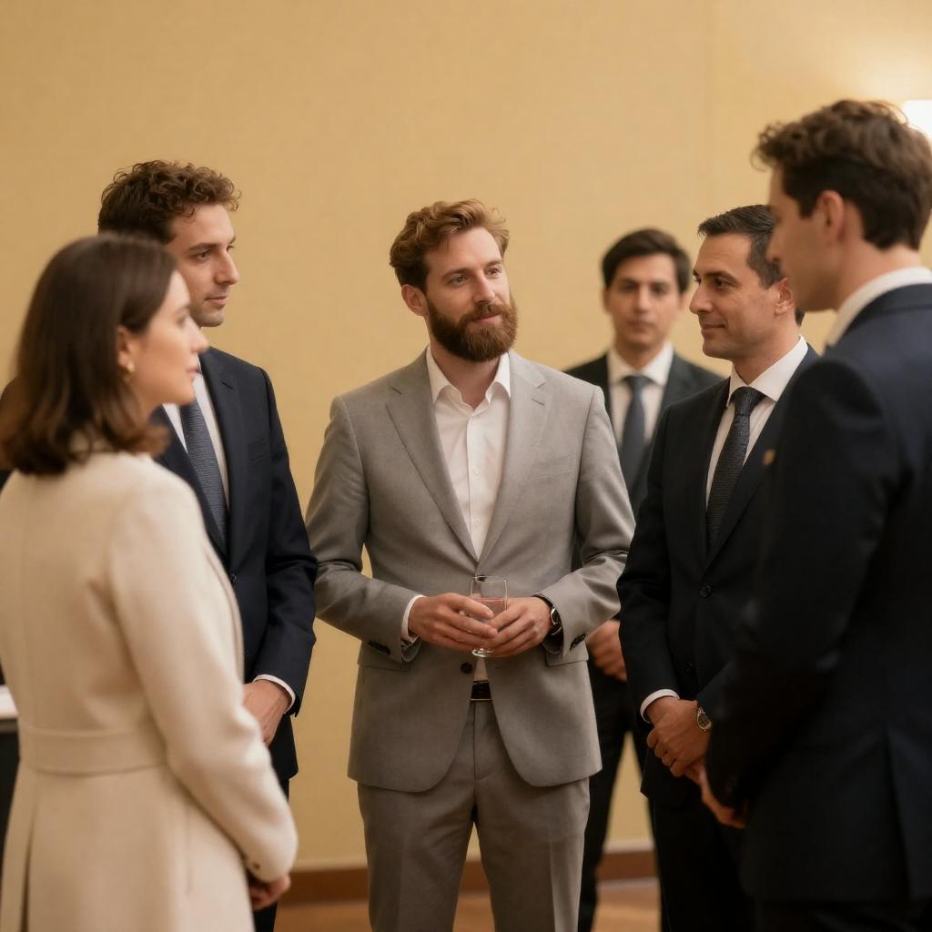 Photograph of six people at a formal gathering. Central bearded man in light gray suit holds a glass, surrounded by men in dark suits and a woman in a cream coat. Warm, ured wall background. Men converse, woman looks ahead.