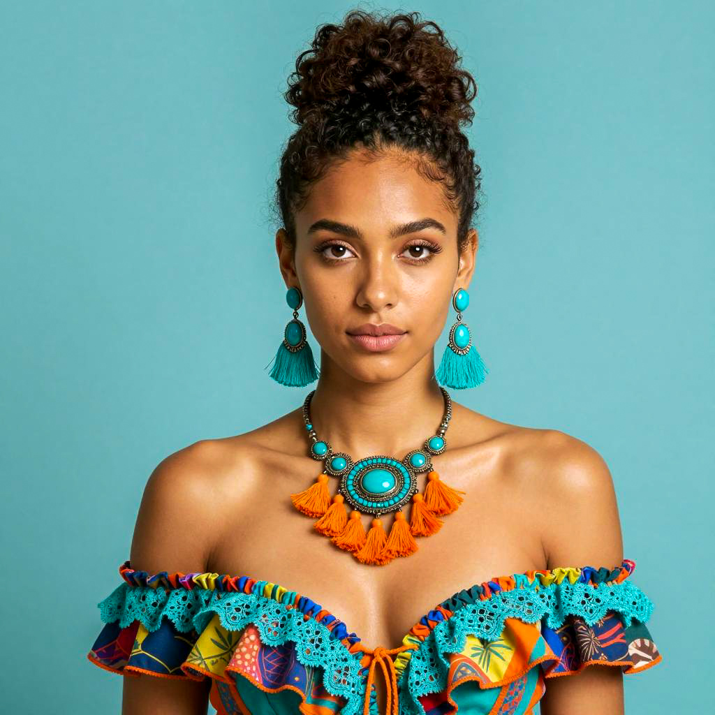 Photograph of a young woman with light brown skin and green eyes, wearing a colorful embroidered dress with red, blue, and green patterns. Her dark hair is styled in two intricate braided buns, and she has large, colorful, spherical earrings with blue, green, and red sections. She has a neutral expression and is centered in the frame. The background is plain and light gray. The "bugiu.com" is in the bottom right corner.
