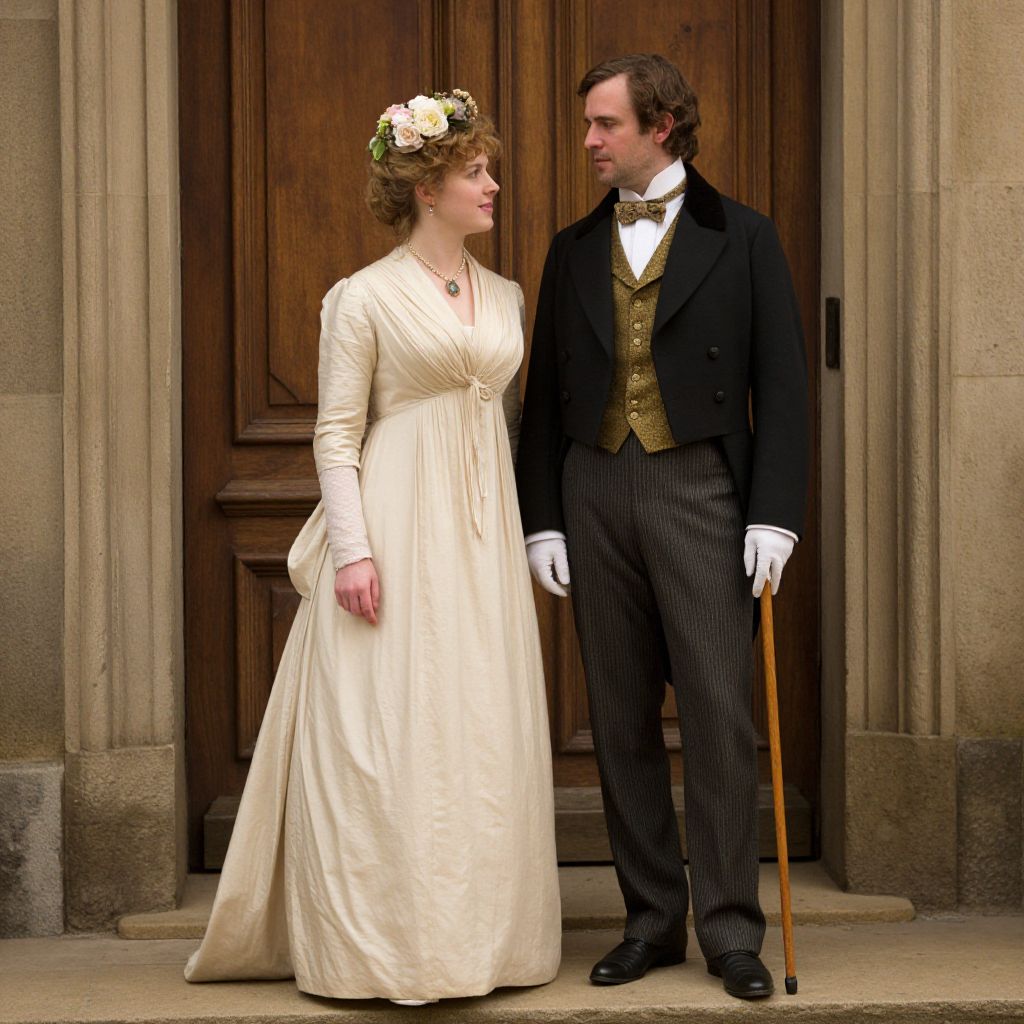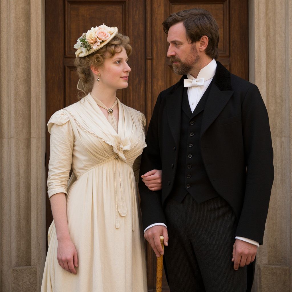 A high-definition digital artwork portrays a Victorian-era couple, with the woman adorned in a cream gown and floral headpiece, and the man dressed in a formal suit with a walking stick, set against a rustic wooden door backdrop, evoking a classic and timeless artistic style reminiscent of historical portraiture.