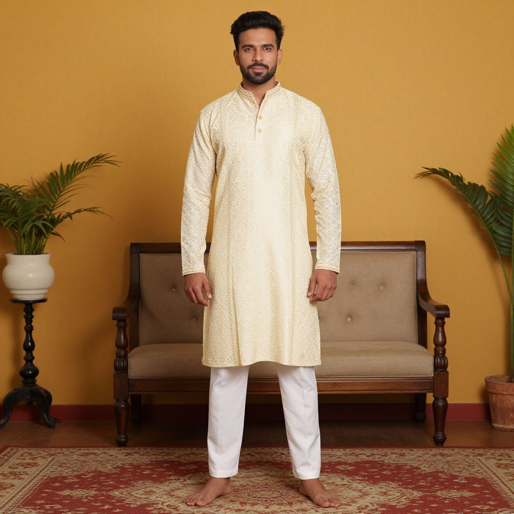 Photograph of a South Asian man standing barefoot in front of a yellow wall. He has a medium build, dark hair, and a trimmed beard. He wears a cream-colored, long-sleeved, embroidered kurta and white pants. Behind him is a wooden armchair with beige upholstery, flanked by potted plants on either side. The floor is covered with a red and beige patterned rug. The man's expression is neutral, and he stands with his hands by his sides. The setting has a warm, traditional ambiance.