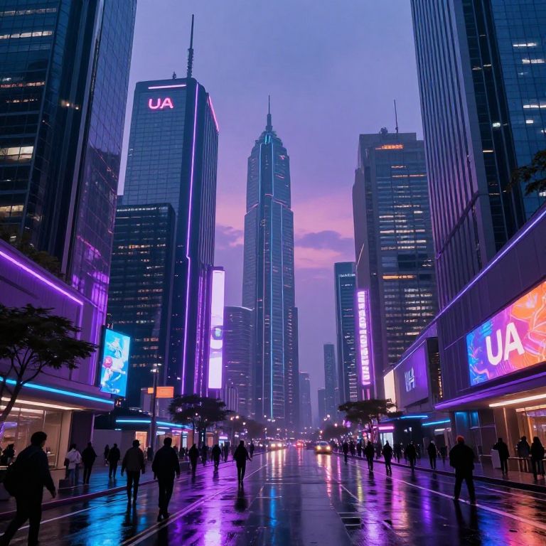 UA themed futuristic cityscape at dusk, sleek skyscrapers with glowing neon signs displaying 'UA', bustling streets with diverse cyberpunk characters, rain reflecting colorful lights, detailed textures, cinematic wide angle view, vibrant purple and blue palette
