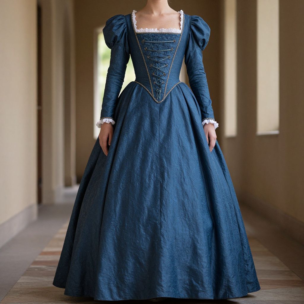 Medieval ball gown dress, a close up of a woman in a blue dress standing in a hallway