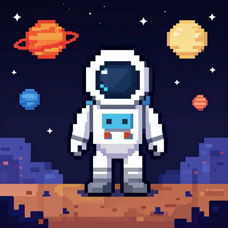Image pixel art showcasing a pixelated space explorer standing on alien terrain, starry night sky filled with pixelated planets and moons, retro pixel sci-fi style with vivid colors and sharp pixel details