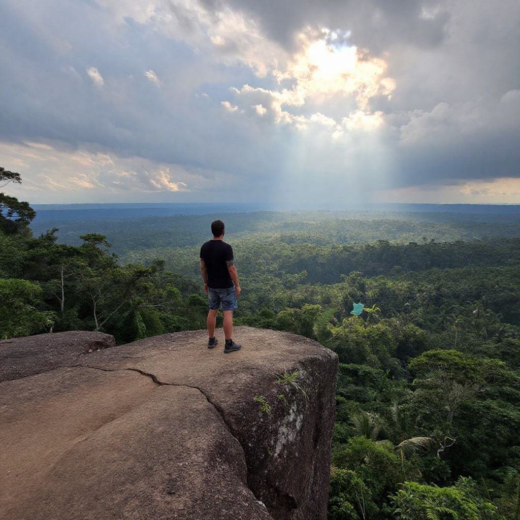Photograph of a solitary man in a green shirt standing waist-deep in a tranquil, turquoise lake, surrounded by dense, forested greenery.
