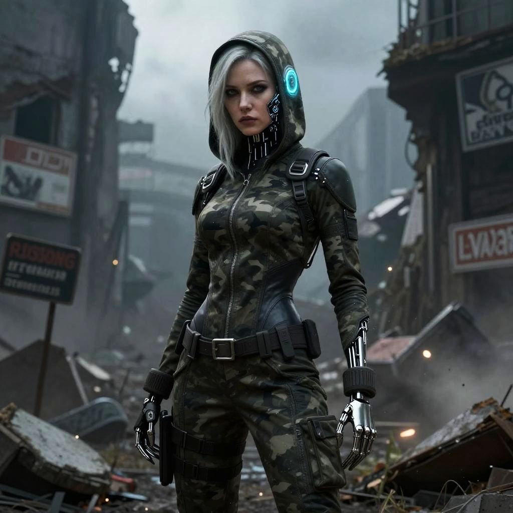 Exposure Bracketing sci-fi grimdark setting, pale nimble female hacker with glowing cybernetic cheek implant and synthetic metallic fingers on one hand, wearing a tight digital camo jumpsuit, standing with a stoic expression with ruins and signs of warfare behind her