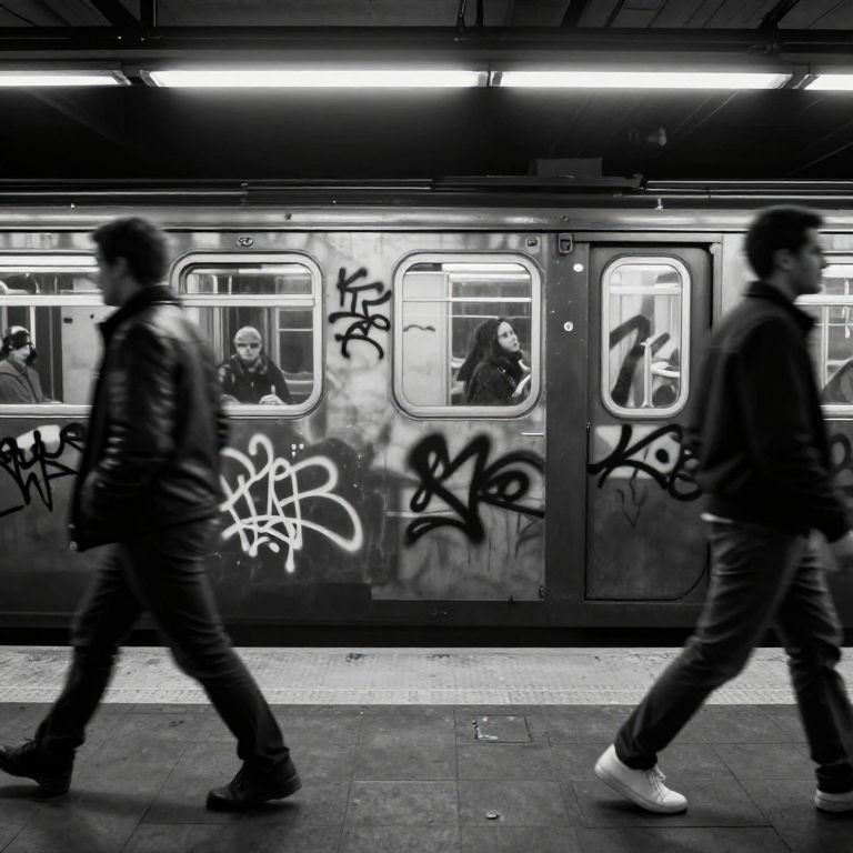 Monochrome street outfits on a vintage subway platform, subway graffiti in background, grayscale aesthetic, realistic textures, motion blur on moving figures, industrial backdrop, cinematic monochrome theme, MidJourney style.