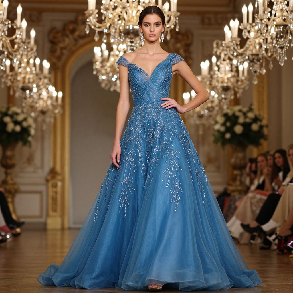 Photograph of a slender, fair-skinned woman with dark, slicked-back hair, walking a fashion runway. She wears an elegant, floor-length, royal blue gown with an off-the-shoulder neckline and intricate beadwork. The gown's voluminous skirt is made of delicate, sheer fabric. She stands confidently with one hand on her hip. The background features an opulent room with ornate, gold-accented white walls and large, sparkling chandeliers. Blurred spectators sit along the right side of the runway. The lighting highlights the woman and her dress, casting a warm glow.