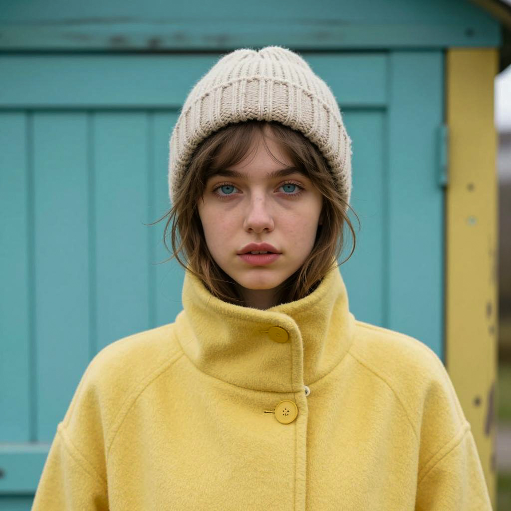 Photograph of a young woman with light blue eyes and fair skin. She wears a knitted beige beanie and a bright yellow coat with a high collar. Her brown hair is slightly messy, with bangs partially covering her forehead. She stands in front of a turquoise wooden structure with a yellow, weathered frame on the right. Her lips are slightly parted. The background includes ured turquoise wood panels. The woman's face is centered, looking directly at the camera with a neutral expression.