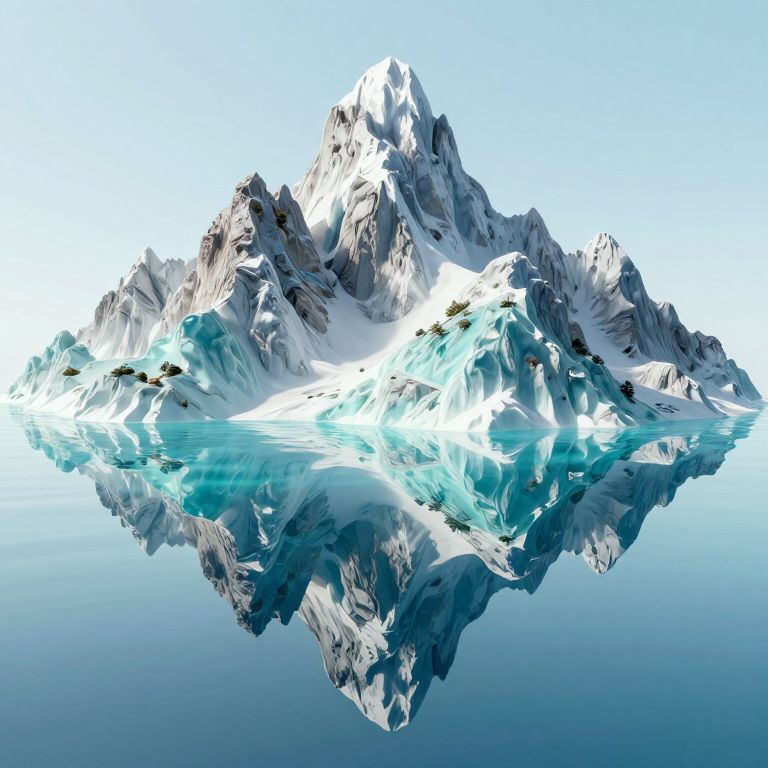 Photorealistic digital rendering of a floating, snow-capped, jagged mountain island with vibrant blue glacial ice reflecting in calm, clear water.