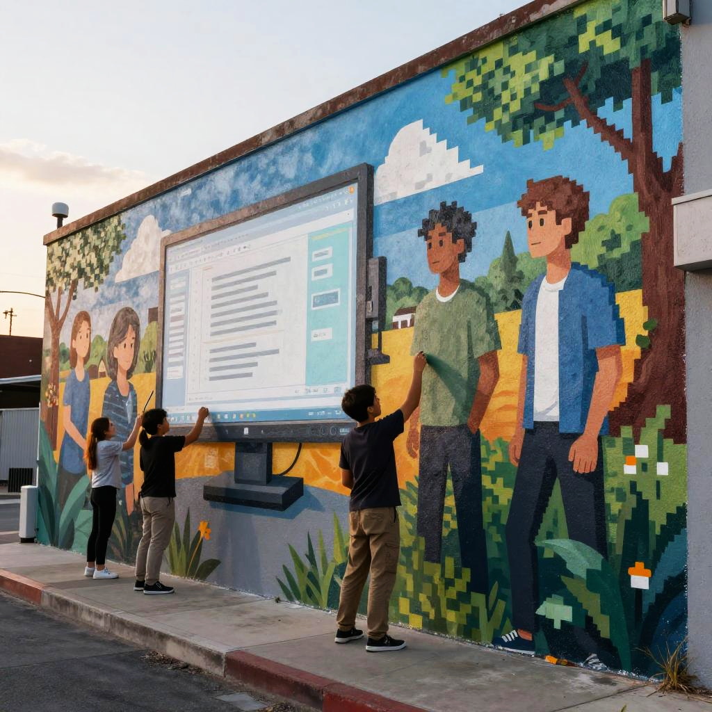 AI finish picture portraying a vivid scene of an AI system finishing a large mural on a city wall at dusk, blending digital art with urban textures, showing pixelated elements transitioning into detailed characters and landscapes, evoking themes of innovation and collaboration.