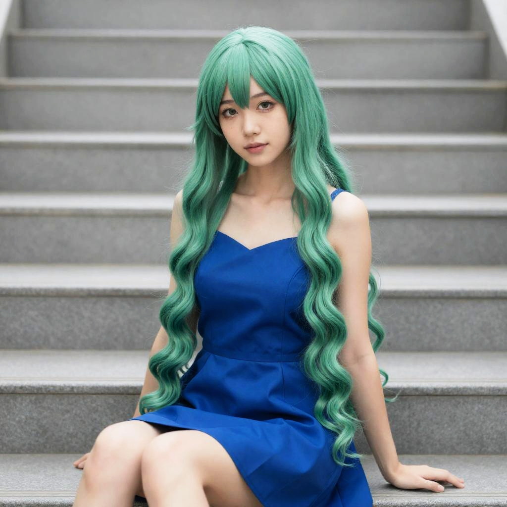 Teal Long Wavy Costume Wig Woman, woman with long green hair and blue dress sitting on steps