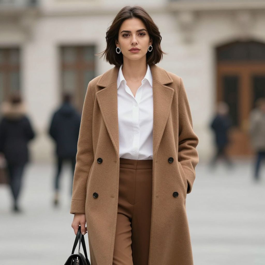 Photograph of a confident woman with short, dark brown hair and light skin, walking down a city street. She wears a beige, double-breasted wool coat over a white, button-up shirt, paired with high-waisted, brown pants. She holds a black handbag in her right hand and wears large, silver hoop earrings. The background is slightly blurred, showing an urban setting with people in dark coats walking and light-colored buildings with windows. The overall color palette is neutral with beige, white, and brown tones.