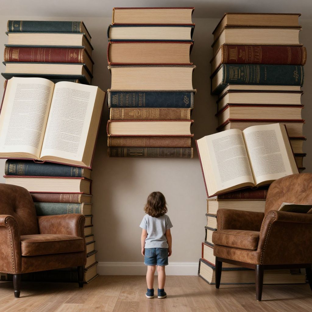 Photograph of a young child with shoulder-length brown hair, wearing a white t-shirt and blue shorts, standing in front of a wall filled with stacked, oversized books. The books are arranged in three vertical columns, with several large open books hanging from the stacks. Two brown leather armchairs flank the child on either side. The floor is wooden, and the wall is plain white. The image has a surreal, whimsical feel, with the oversized books creating a playful, magical atmosphere. The child is centered, facing the wall, with books towering above them.