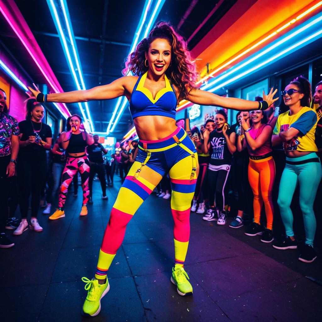 Exuberant female street dancer wearing a vibrant blue, yellow, and pink spandex outfit with garter belt details. She poses energetically with neon lighting accentuating her detailed makeup and curly hair. The lively scene is set in a crowded indoor street or club setting with a diverse group of onlookers dressed in colorful athletic clothes.