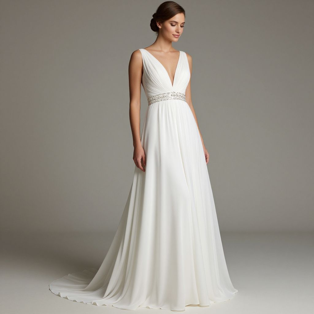 Photograph of a young woman with light skin and dark brown hair in an elegant updo, wearing a sleeveless, deep V-neck, white satin wedding gown with a beaded waistband. The gown has a flowing, floor-length skirt that pools slightly on the ground. She stands against a plain, gray background, looking downward with a serene expression. The fabric of the dress has a smooth, glossy texture, and the overall style is classic and sophisticated. The lighting is soft, highlighting the dress's sheen and the woman's graceful posture.