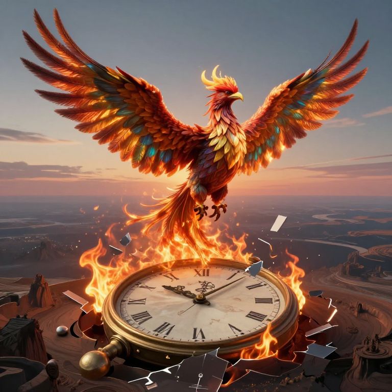 A surreal digital composition featuring a grand phoenix rising from an shattered timepiece in a style reminiscent of melting clocks, with intricate details of fire and feathers seamlessly merging into abstract temporal elements. This unusual aerial perspective highlights the iridescent wingspan of the phoenix as it soars towards a cryptic horizon, evoking profound feelings of rebirth and cosmic enigma.
