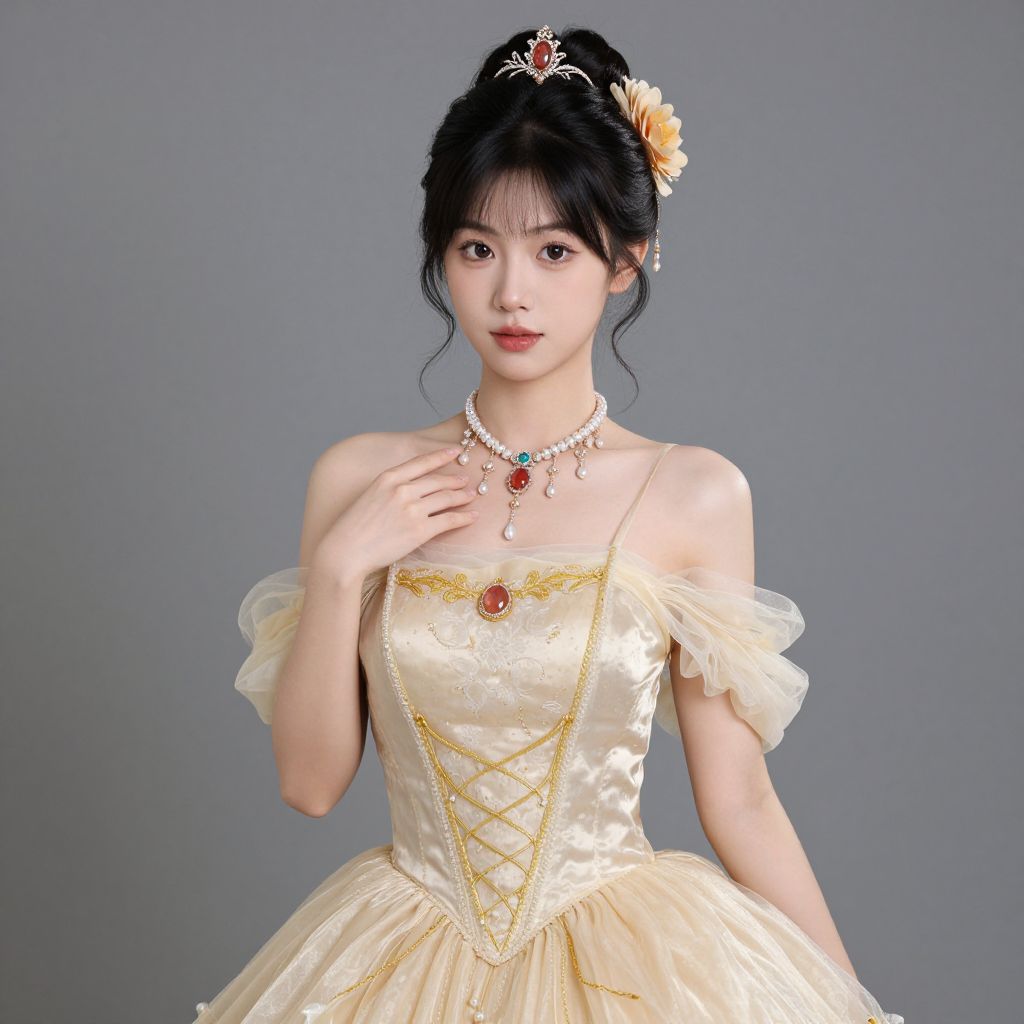 Photograph of an East Asian woman with fair skin and black hair styled in an updo with a yellow flower. She wears an off-the-shoulder, cream-colored, satin ball gown with gold lace-up detailing and puffed, sheer sleeves. She is adorned with a tiara, a necklace featuring a red gem, and matching earrings. Her makeup is subtle with pink lipstick. The background is a plain, gray studio backdrop, emphasizing her elegant attire and poised expression. She gently touches her neck with her right hand. The overall style is reminiscent of a fairy tale princess.