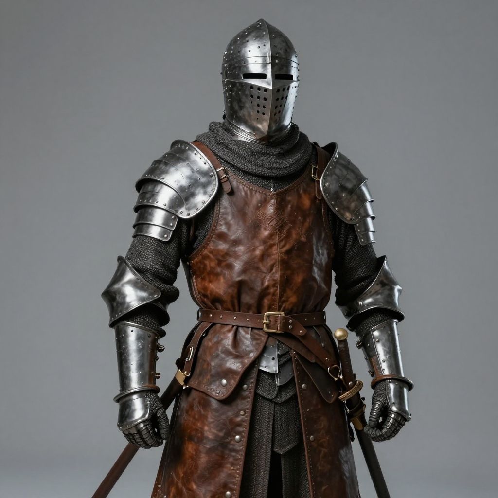 Photograph of a medieval knight in full plate armor, standing against a white background. The knight wears a shiny, silver helmet with a narrow eye slit, and a black cloth scarf around the neck. The chest and shoulder plates are reflective, with a dark brown belt cinched at the waist. The knight holds a long, pointed sword in the right hand, with the blade upright. The left hand is gloved and rests by the side. The armor's texture is metallic and smooth, contrasting with the black, slightly textured cloth of the skirt and scarf. The overall appearance is stern and imposing.
