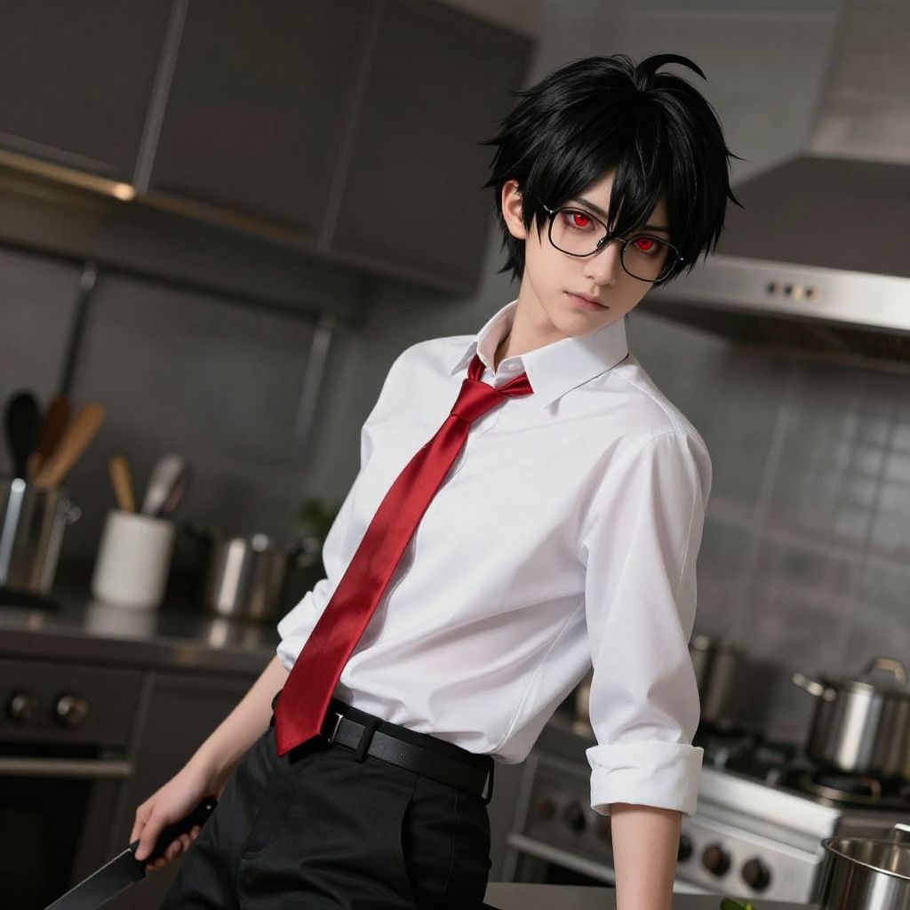 Masterpiece, best quality, highres, cinematic lighting, dramatic angle, 1boy, red eyes, black hair, pointy hair, white shirt, red necktie, black pants, belt, glasses, cooking, apron, turning head, looking at viewer, kitchen, holding knife