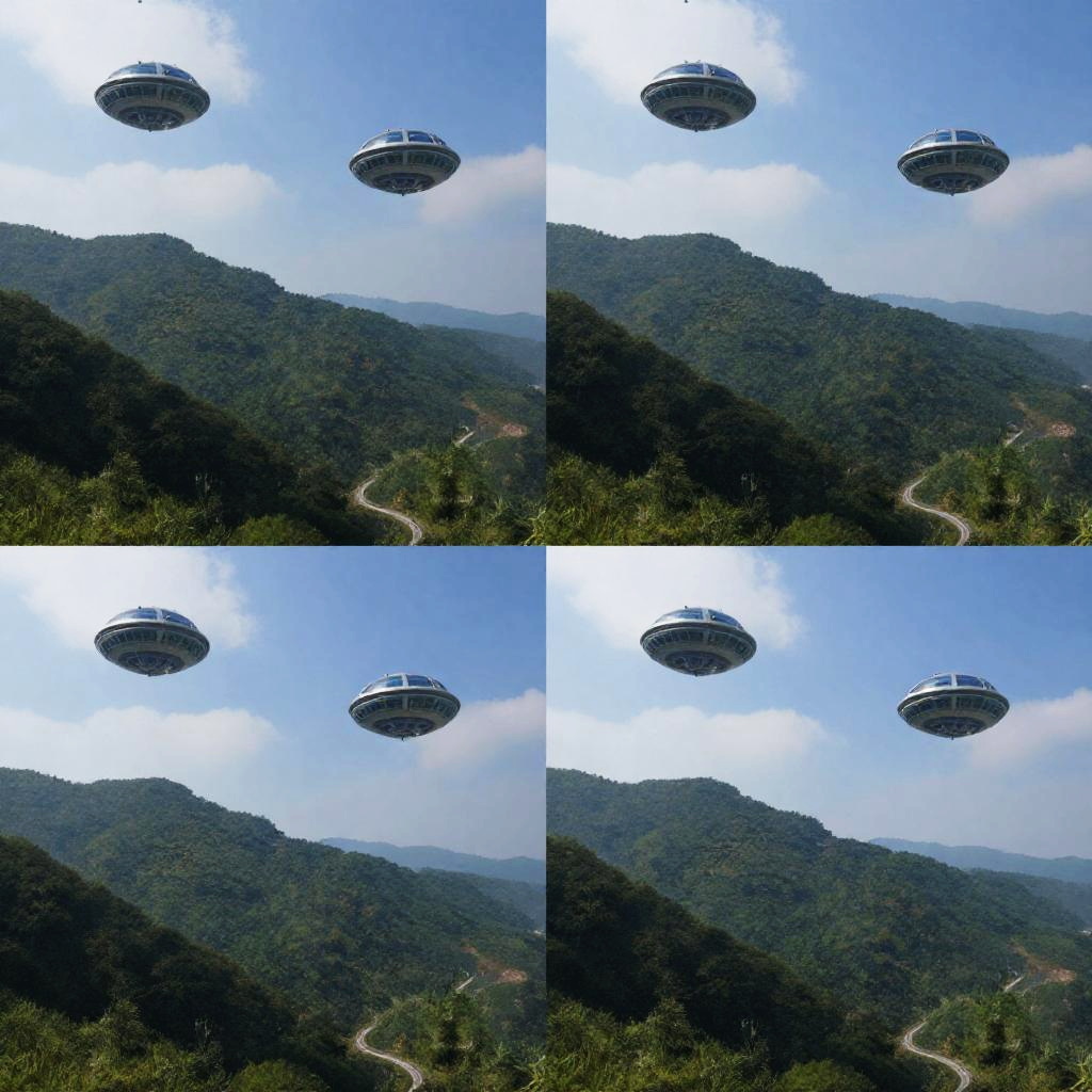This image is a collage of four photographs showing a mountain landscape with dark green, forested hills and a winding road. At the top of each photo, there are two futuristic, dome-shaped structures floating in the sky. The background has a bright blue sky with some clouds. The images are slightly blurry and have a surreal, sci-fi feel.