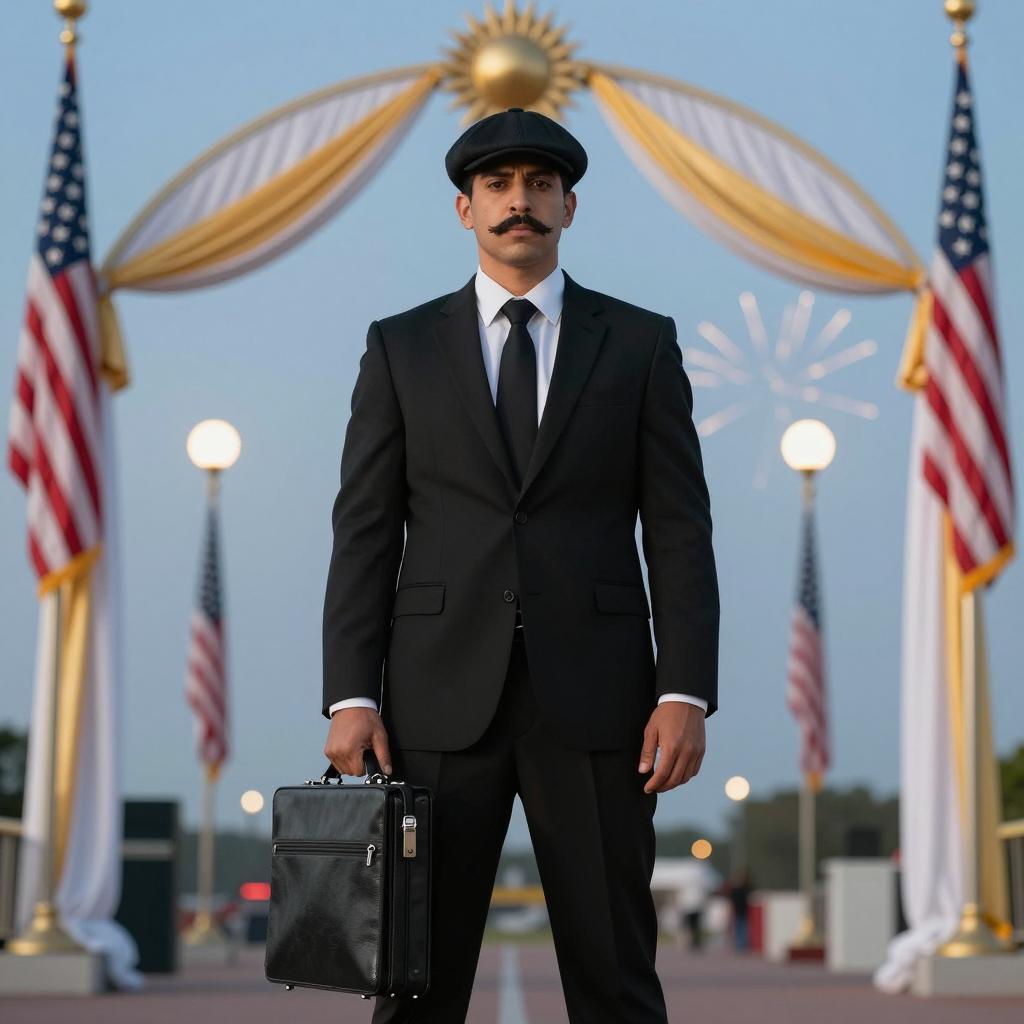 Man with dark mustache, wearing black suit, white shirt, black tie, and black flat cap, stands holding black briefcase. Background: arch with American flags, lights, and fireworks. Blue sky, white and yellow drapery. Centered, front and center.